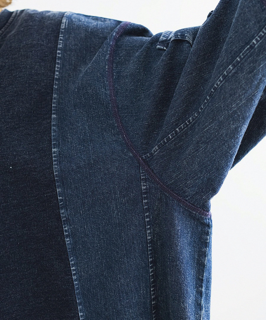 由深淺不一的染製丹寧拼接構成